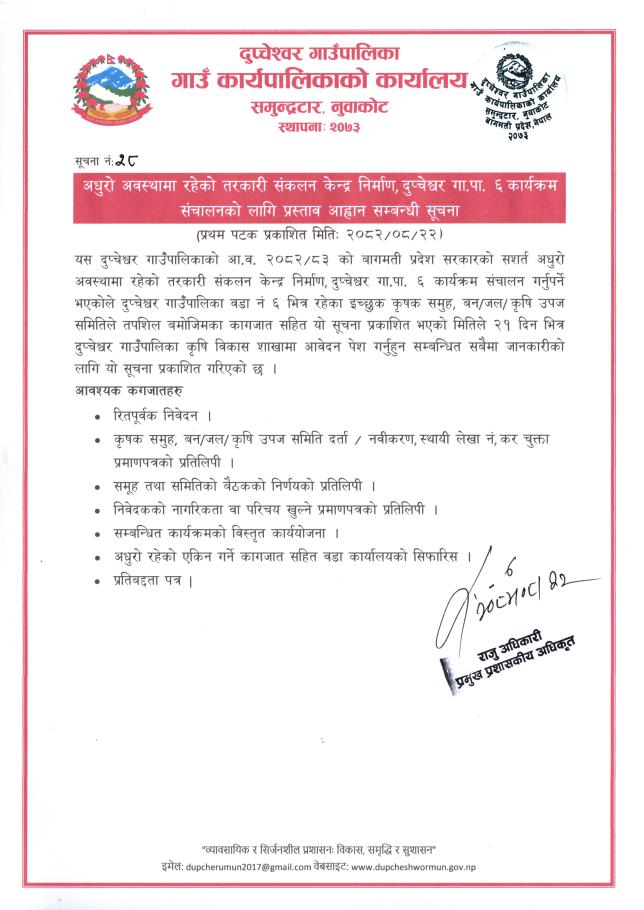 अधुरो अवस्थामा रहेको तरकारी संकलन केन्द्र निर्माण, दुप्चेश्वर गा.पा. ६ कार्यक्रम संचालनको लागि प्रस्ताव आह्वान सम्बन्धी सूचना
