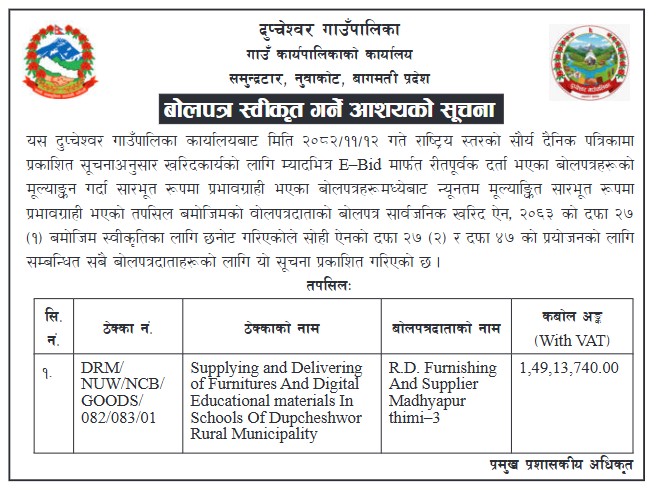 बोलपत्र स्वीकृत गर्ने आशयको सूचना