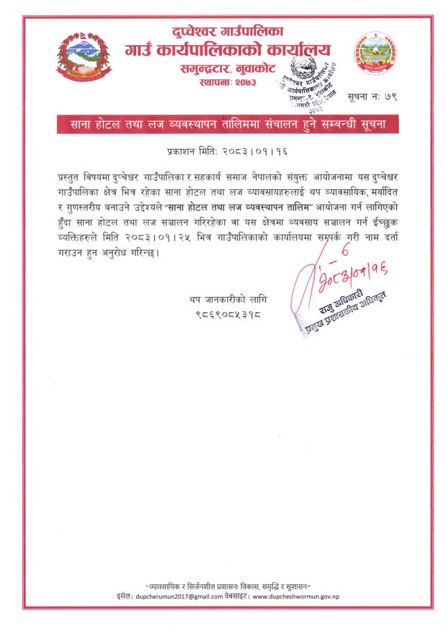 साना होटल तथा लज व्यवस्थापन तालिम संचालन हुने सम्बन्धि सूचना।